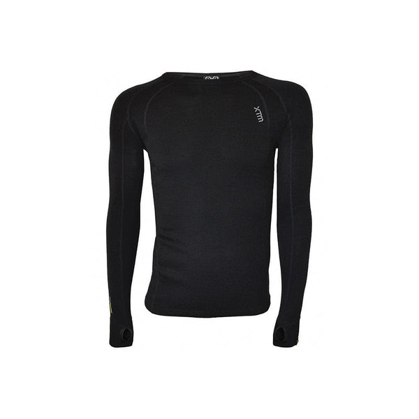 XTM 230gsm Merino L/S Crew Mens Black Long Sleeve T-Shirt 100% fine Australian Merino Raglan Sleeve The XTM Merino Long Sleeve crew neck top is made from 100% fine Australian Merino Wool and at 230gm is the perfect thermal base layer. Merino Wool acts as a thermo-regulator, keeping you cool in warmer climates and warm in colder climates. It's odour repellent, extremely breathable, silky smooth and non-itch. FEATURES 100% fine Australian merino 230g/m2, 20.5 microns Raglan sleeve for extra comfort Interlock knit Thumb gussets UPF 50+ Non itch