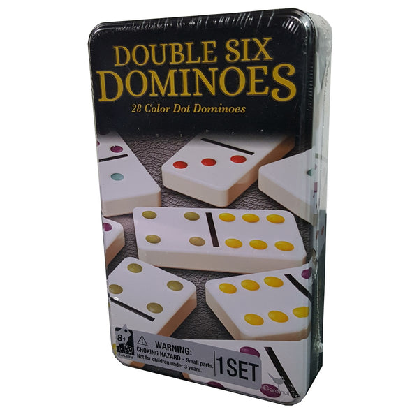 Cardinal Dominoes Double 6 Coloured In Tin playset comprises 28 multi-coloured dominoes with a tin storage box. This set of domino pieces are coloured and sized for children to play...