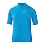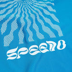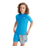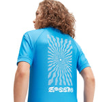 Sun protection swimwear for swim, surf and beyond. Perfect for beach days spent in and out of the water, our bright blue Short Sleeve Rash Top is ideal for active kids and features a retro-style sunburst and Speedo logo on the back. The short sleeve pull-on style offers protection from the elements while the UPF40+ fabric provides sun protection both in and out of the water. Offering higher chlorine resistance than standard swimwear fabrics, our EnduraBrite fabric delivers superb colour performance and fits like new for longer with CREORA¨ HighCloª. Made in part from recycled plastic bottles - the polyester yarn in the fabric is made from 100% post-consumer waste.