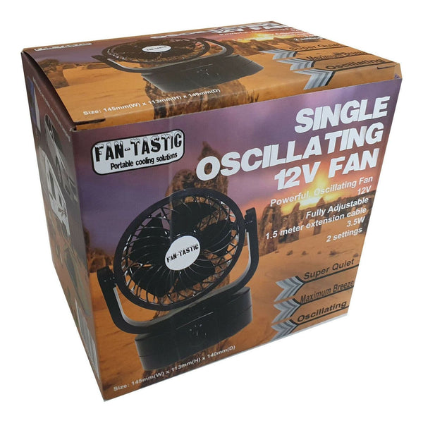 12 Volt Powerful Compact Fan is perfect for those hot nights or just to move some air around you tent, caravan, car, boat or RV. With a full adjustable angles, oscillating fan, stick on base if required, 2 speed modes, super quiet under -50db and low power draw. Includes 1.5m extension cable.