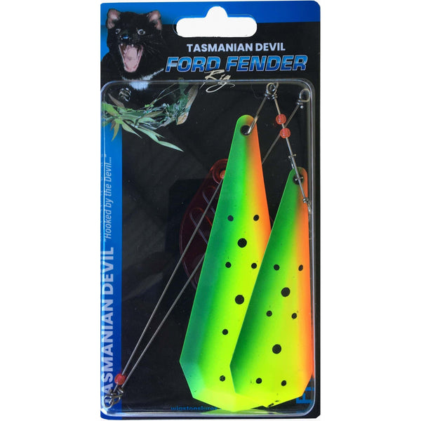 The Tasmanian Devil Ford Fender design is the best-known style of in-line trolling attractor, it attracts fish from far and wide with its flashing blades.
