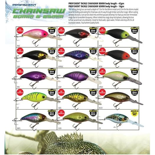 The Profishent Tackle Chainsaw 80mm 7.5m Diver has a through wire construction to handle the toughest of Australian natives,it can be trolled to a maximum depth of 7.5m (24ft) perfect for casting in rivers or dams enabling this lure to get down into strikezone quickly!