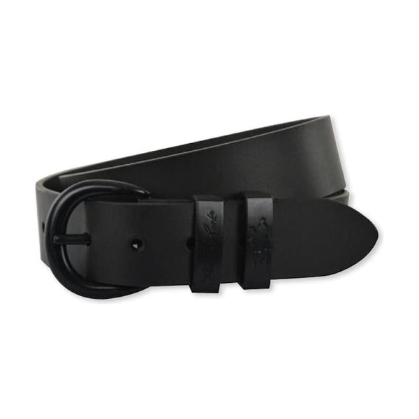 Powder coated metal buckle and metal embossed logo twin belt loops