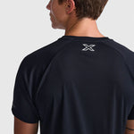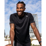 Double-knit contsructed main panel leverages an inner layer to transport sweat away from skin and an outer layer to disperse moisture on surface, delivering rapid moisture management.