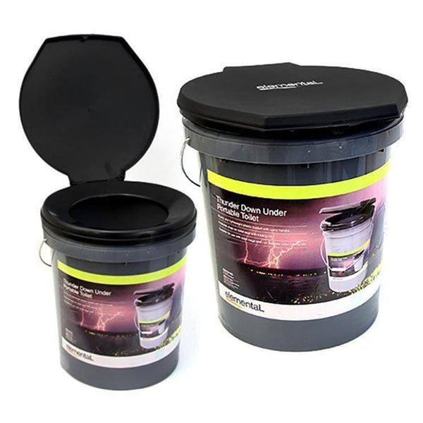 The Elemental Thunder Down Under Portable Toilet is rugged and lightweight and is a bucket style design and has a snap on hinged lid just like a toilet at home. Comes with a convenient carry handle for easy transportation. Great for camping and touring where access to toilets are limited.