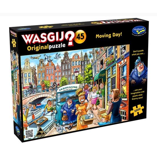 Wasgij Original 45 - Moving Day! (1000 pieces). Enjoying a well-earned break, Granny Wasgij is on a stroll through Old Amsterdam. It's moving day for one of the locals, but something has caused chaos by the canal and panic is spreading through the crowd. Is everything going to plan, or are hopes of a smooth move starting to slip away? What has Granny seen that has panicked the pedestrians? That is the image you need to puzzle.