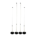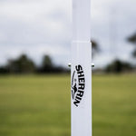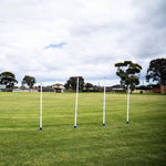 introducing the new easy-to-use retractable aussie rules football goal posts from Sherrin. Manufactured from a durable PVC material that is light, portable and can withstand rigerous play. Featuring 2x goal posts (2.1m), 2x point posts (1.8m) and 4x rubber bases to hold the posts securely in place. Can be used on grass & hard playing surfaces. FEATURES: - 2x Goal Post (Height: 2.1 metres) - 2x Point Post (Height: 1.8 metres) - 4x rubber bases (1.2kg ) - Metal pegs for added stability for use on grass. - Carry bag included.