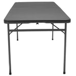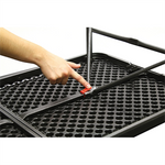 Compact folding tables with multiple height settings for dining and food preparation.