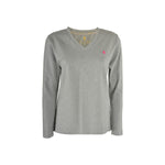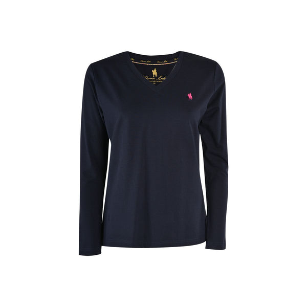 Classic fit long sleeve tee, stretch for comfort and movement, V neckline, longer back hem, horseman embroidery on chest.