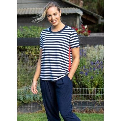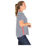 PRODUCT DETAILS Colour: NAVY/WHITE Features: Breathable bamboo fabric keeping you cool, natural fibre, soft & cool handfeel, yarn dyed stripe, rib neckline, contrast Thomas Cook logo internal bind, curved hem, horseman embroidery on side hem, stretch for comfort and movement Fabric: 96% Bamboo, 4% Elastane Jersey, 300gsm