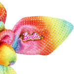 Add some Rainbow fun to her hairdo with this Barbie Rainbow Fantasy Tie Scrunchie. The tie is a popular fashion-forward style paired with rainbow fabric with flecks of glitter for a sparkling effect. Features a metal Barbie logo charm.