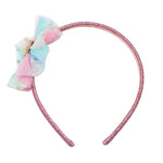 Accessorise her outfit with this Barbie Rainbow Fantasy Tulle Headband. It features a metal enamelled heart with glitter Barbie print framed with tiny rainbow pearls. Cushioned on a bed of pastel tulle embellished with holographic sparkles for a burst of sparkling colour.