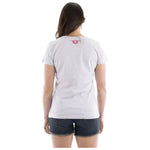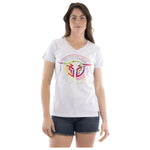 V-neck • Large front feature Bullzye tie-dye print • Bullzye back neck print • Self fabric bind on neck • Chain stitch detail on neck and shoulders • Logo hem label.