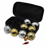 Description Features: Buffalo Metal Boule Bocce Set Contains 8 steel Balls and 1 Wooden Jack Ball 4 xSilver and 4 x Gold balls Handy nylon carry case with handle Perfect for those backyard games or beach days Chrome Coating